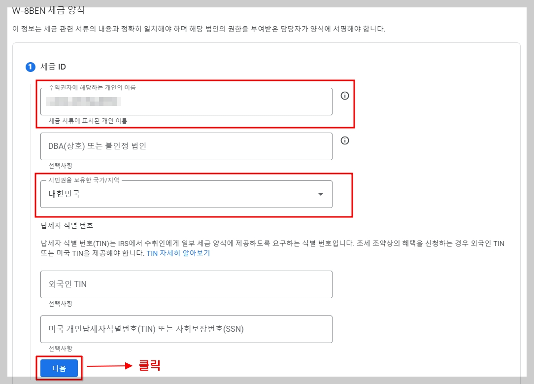 먼저 세금 id 정보를 입력하게 되어 있는데요, '수익권자에 해당하는 개인의 이름' 자리에 본인 이름(영문)을 입력해 주시면 되고,