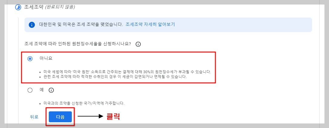 | 세금 조약 반드시 '아니요' 선택 | 블로그 디스플레이 광고 수익은 세금 조약 적용 대상 아님 |