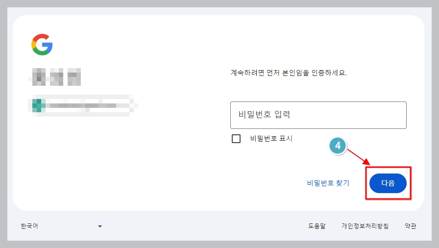 이미 구글 로그인한 상태이더라도 한 번 더 비밀번호 입력하고 인증하는 절차를 거칩니다.
