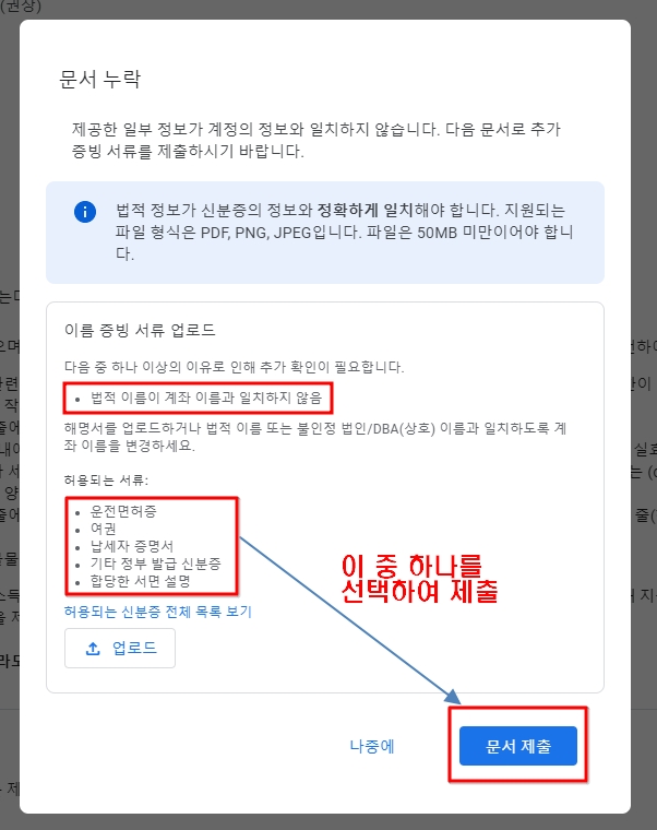 - 애드센스 대시보드 → '문서 제출' 클릭 → 신분증 업로드