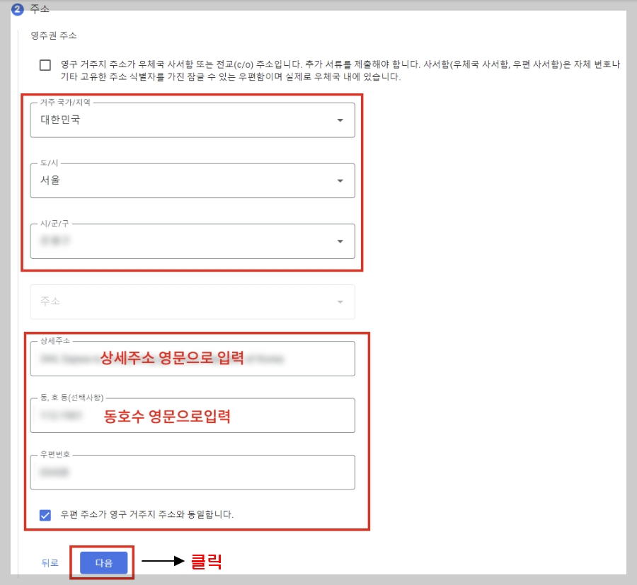 나머지 내용만 영문으로 입력해 주시면 됩니다. 그리고 가장 아래의 '우편 주소가 영구 거주지 주소와 동일합니다'는 체크해주세요.